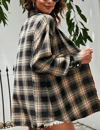 Oversized plaid flannel long sleeve button down shirts for women, checkered gingham pattern buffalo plaid shirt
